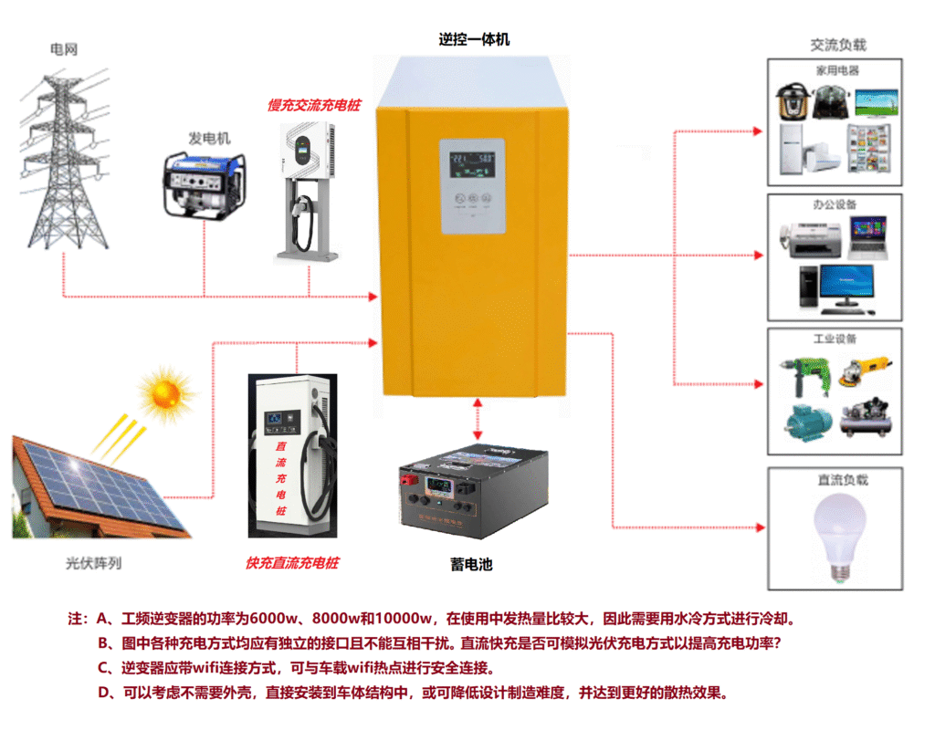 为了打造一个永不缺电的房车,必须有适当大的蓄电池和足够大的光伏板。在缺少阳光的特殊时期还需要有多样的充电方式。下图中列出了几乎所有充电方式了,这些充电方式通常是独立的—-比如快充桩取电需要一个取电器(本质上是一个逆变器),或者是间歇性的—-比如行车充电。我现在谋求把这些方式全部集成在一起,变成集所在充电方式为一体的充电站,同时针对既有的设计缺陷进行改进,力争打造出一个完美的产品。下图为示意图,您有兴趣参与进来吗?